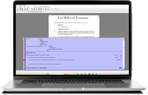 Express Wills takes the hard work out of drafting wills with a simple question-and-answer format backed up by a bank of nearly 1,000 precedents. After completing a set of simple questions, the interactive system combines your answers with the right precedents to produce a will. You can then add unique practice details, additional clauses, standards, and commentary if necessary.
